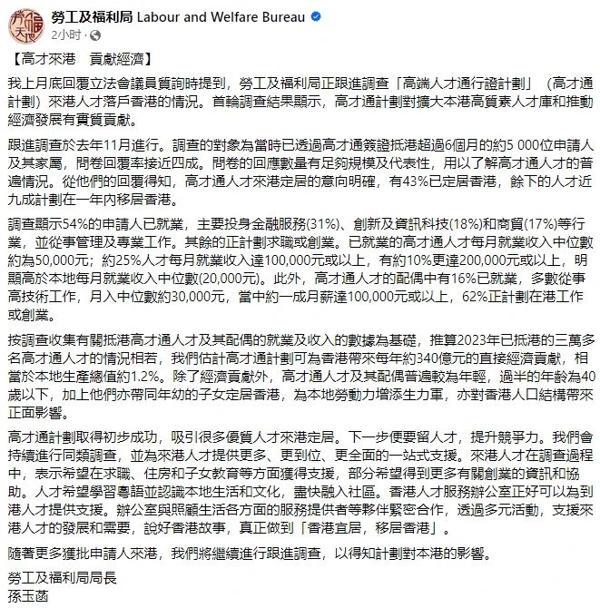 2月22日,香港勞工及福利局局長孫玉菡在社交平臺公布高才通的首輪跟進調查結果,直指:單推算已抵港高才,已為香港帶來年約340億元的直接經濟貢獻!