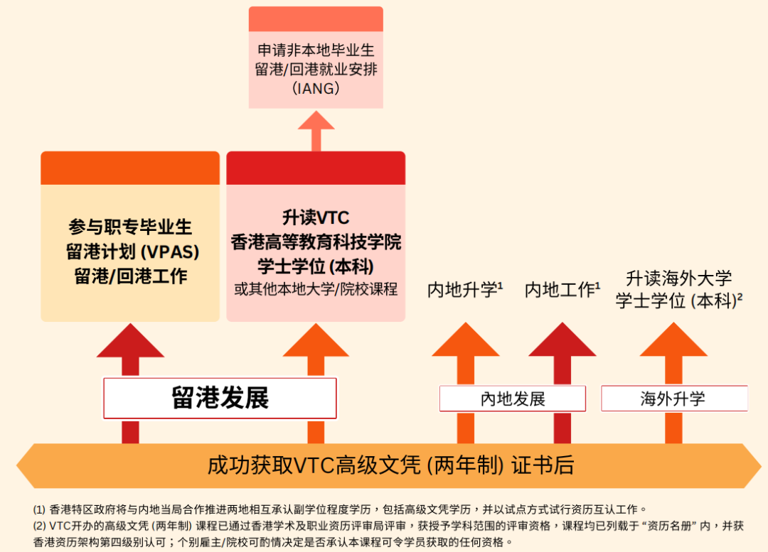 「職專畢業(yè)生留港計劃 (VPAS)」為2024/25學(xué)年及2025/26學(xué)年來港修讀VTC指定全日制高級文憑課程的非本地生提供留港機會。在畢業(yè)后6個月內(nèi),可申請為期1年的簽證留港尋找與專業(yè)相關(guān)的工作,借此應(yīng)對香港技術(shù)行業(yè)中端人才不足的困難。計劃試行2年,屆時檢討,決定是否繼續(xù)推行。