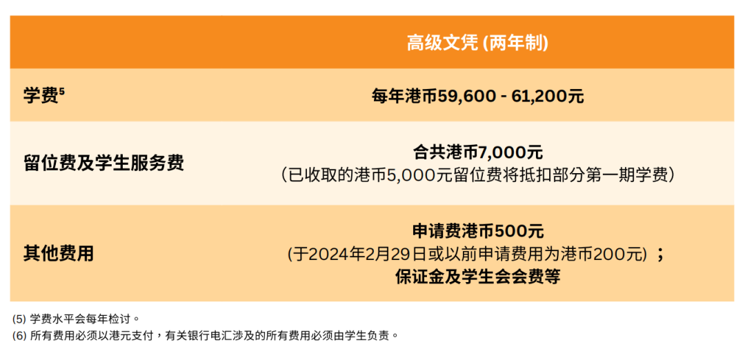 學(xué)費、住宿費和生活費等總體費用,一年大約13萬港幣。高級文憑課程學(xué)費一年約港幣6萬。學(xué)費水平每年均會根據(jù)通脹、課程架構(gòu)及有關(guān)因素予以檢討。此外,學(xué)生宿舍住宿費一年約港幣2萬;而其他生活費(包括伙食費、交通費和其他雜費)一年約港幣5萬。