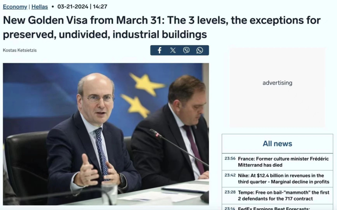 哈齊達基斯宣布,希臘“黃金簽證”的新政策將從2024年3月31日起啟用,“過渡期”截止2024年9月30日。根據(jù)新的規(guī)定,投資額度和投資者所需要購買房產的面積都將發(fā)生改變。