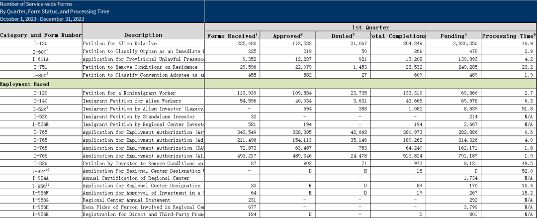 √ I-956(區(qū)域中心授權(quán)申請表):移民局一共收到了33件申請,批準(zhǔn)了89件,還有170件等待審批,平均審理周期10.4個(gè)月;