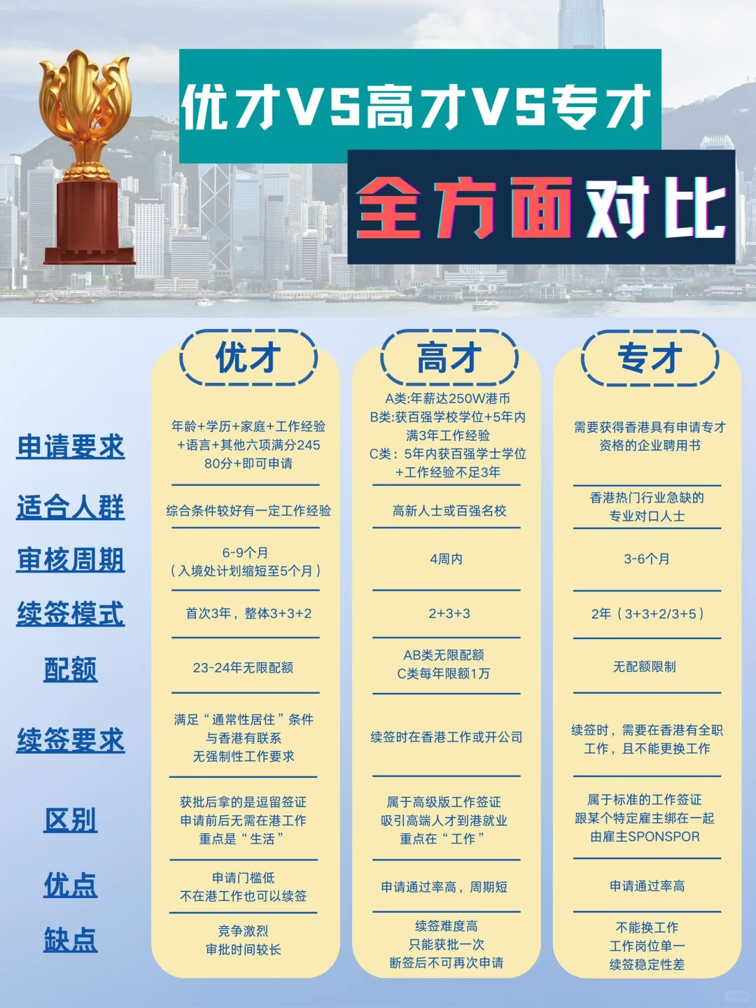 2023年1月1日,香港優(yōu)才計劃正式取消了配額限制,為期2年。同時還有諸多利好,包括:新增名企加分項、首次入境可獲準在港逗留時間延長至3年、優(yōu)化甄選機制(取消面試、增加甄選次數(shù)、縮短審批時間)等。