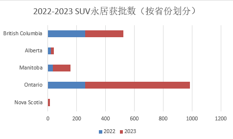 在IRCC官方釋出的獲批數(shù)據(jù)中顯示,截至2023年11月,加拿大SUV申請的獲批數(shù)為1145份,其中安大略省通過的SUV申請達725份,占總獲批數(shù)的63.3%,除了安大略省外,BC?。?65份)和曼?。?20份)的永居獲批數(shù)占比也較高,這也讓大家將SUV視作能夠一步到位定居理想城市的優(yōu)選。