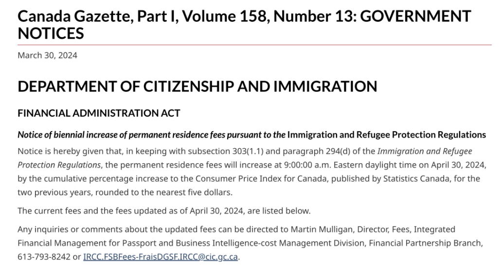 2024年4月30日起,加拿大移民申請費用上漲幅度對比如下↓