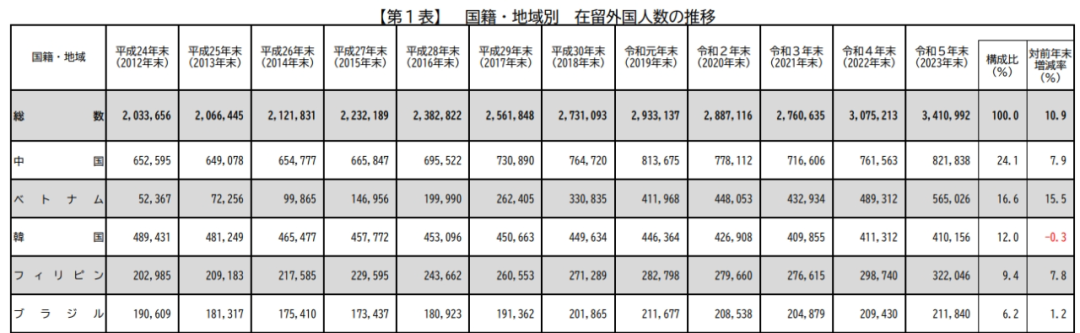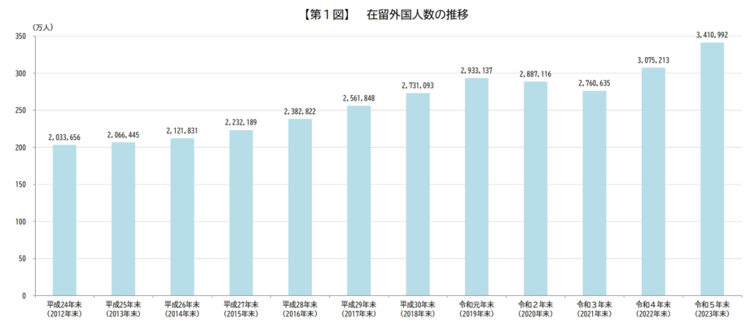 根據(jù)日本出入國管理局公布的數(shù)據(jù),截至2023年底,日本境內(nèi)的外國人居留者數(shù)量已超過341.9萬人,比上一年增加了11%,創(chuàng)下了歷史新高。