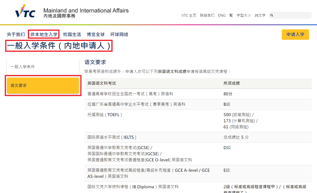 - 憑學(xué)歷成績(jī)申請(qǐng)入學(xué)的申請(qǐng)人需符合英語(yǔ)語(yǔ)文要求,關(guān)于可接受的英語(yǔ)考試成績(jī),可到VTC 內(nèi)地及國(guó)際事務(wù)處網(wǎng)頁(yè)(https://miao.vtc.edu.hk/sc)查看: