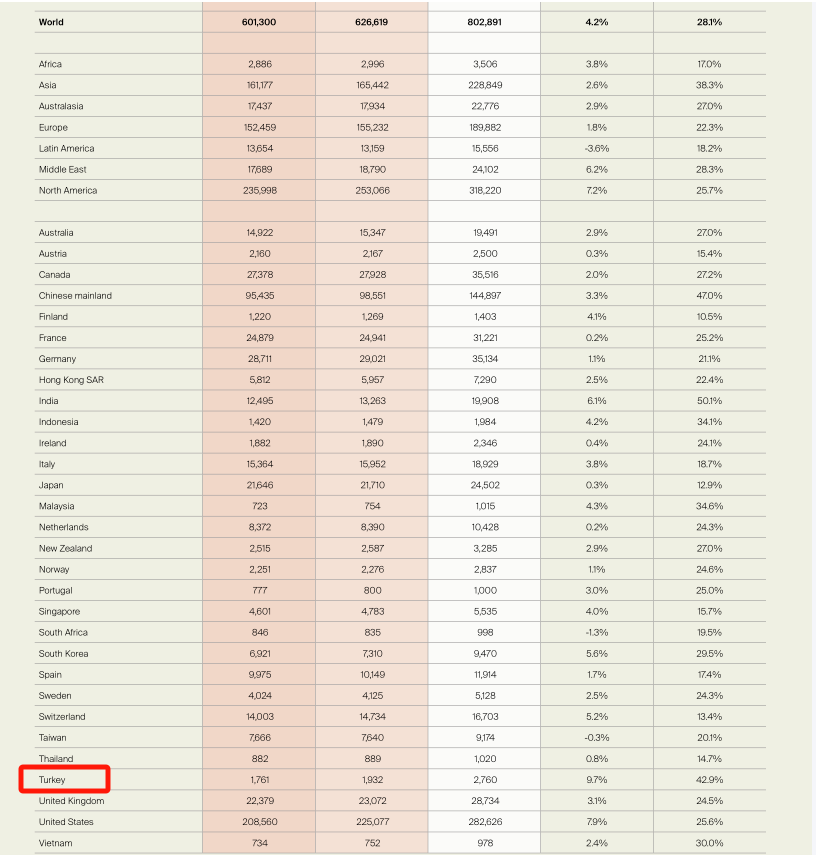 萊坊(Knight Frank)的《全球財(cái)富報(bào)告》顯示,土耳其去年成為全球超級(jí)富豪激增的領(lǐng)跑者。報(bào)告比較了2022年至2023年的數(shù)據(jù),將“超級(jí)富豪”定義為財(cái)富超過(guò)3000萬(wàn)美元的人。在調(diào)查的國(guó)家中,土耳其以9.7%的漲幅穩(wěn)居榜首。2022年,土耳其擁有1761名超高凈值個(gè)人,這一數(shù)字在2023年飆升至1932人。美國(guó)以7.9%的增幅緊隨其后,印度以6.1%的增幅排名第三,中國(guó)大陸的超級(jí)富豪的增幅為3.3%。