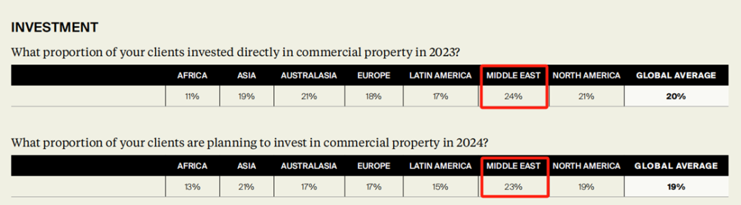 與此同時(shí),全球財(cái)富報(bào)告中披露了全球投資人投資區(qū)域的分布數(shù)據(jù),數(shù)據(jù)顯示中東地區(qū)的投資占比ZUI高達(dá)24%,高于其他投資區(qū)域。