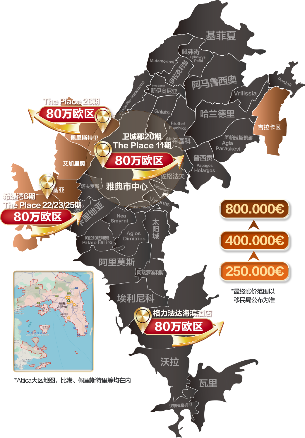 1、阿提卡大區(qū)(包含比港和佩里斯特里區(qū)域)、塞薩洛尼基、米科諾斯、圣托里尼以及人口超過3100人的島嶼(包含克里特島)漲價至80萬歐元投資額;其余地區(qū)投資額上漲到40萬歐元。