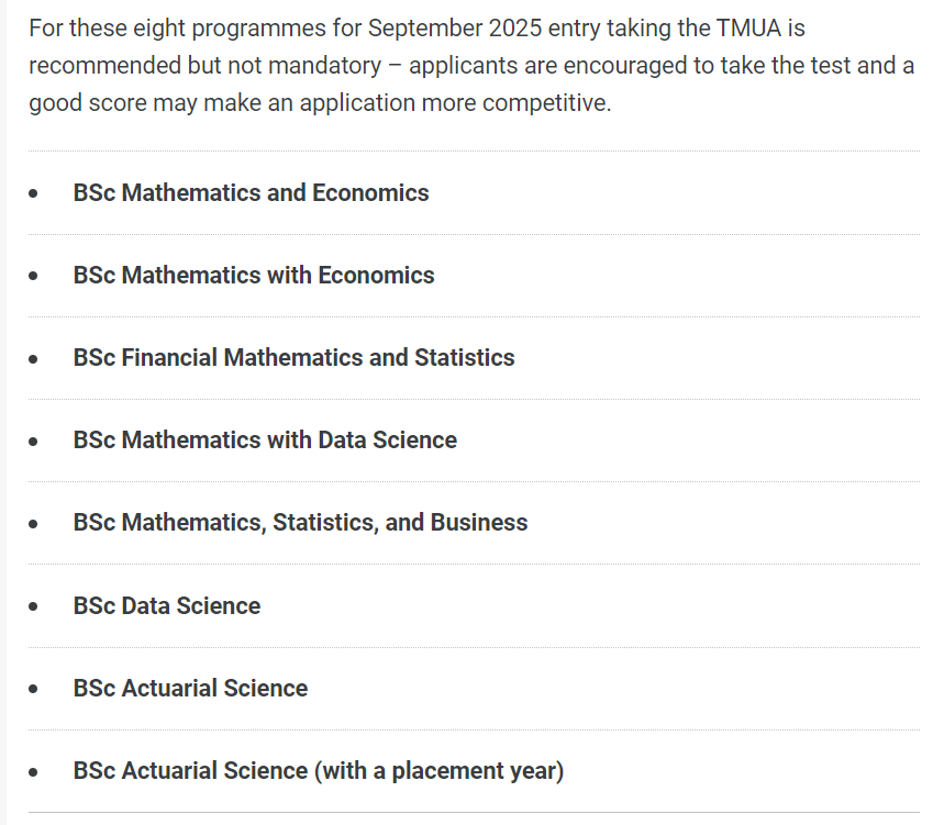 2025年9月入學(xué)的這八個(gè)專業(yè),建議參加 TMUA,但不是強(qiáng)制性的——鼓勵(lì)申請(qǐng)者參加考試,良好的分?jǐn)?shù)可能會(huì)使申請(qǐng)更具競爭力。