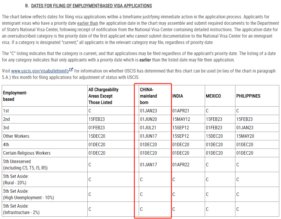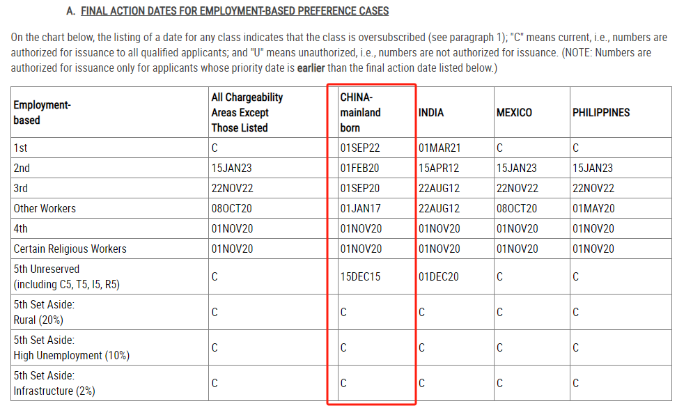 表A是指有簽證名額的排期。表A排期到了,就是說有一張綠卡名額可以簽發(fā)給你了。當表A日期前進到申請人的優(yōu)先日期,如果投資人在美國境外,且I-526已經(jīng)獲批,會收到廣領館的面試安排通知;如果人在美國境內(nèi),就可以在美國遞交I-485轉(zhuǎn)換身份申請了。