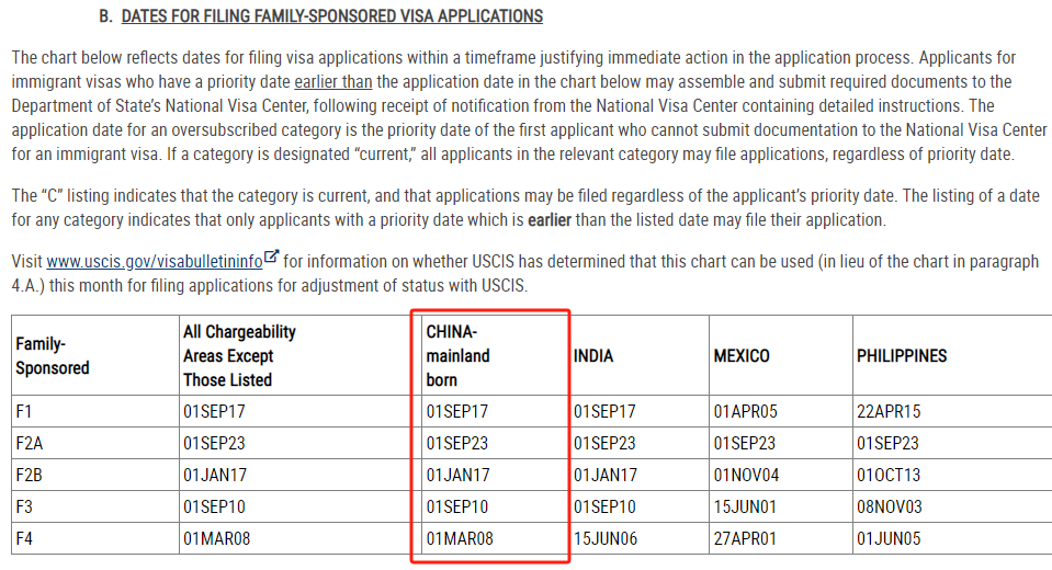 表B是遞件排期,僅適用于在美國境內(nèi)調(diào)整身份的申請人;若申請人不在美國,則適用領館處理,請看表A。國務院發(fā)布排期之后,通常幾天之內(nèi)移民局會表態(tài)本月是否可用表B。若你在美國境內(nèi)調(diào)整身份,表B排期到了,并且移民局表態(tài)當月你所在類別可以使用表B,那么你就可以遞交I-485表格調(diào)整身份了。若表B不可用,則需要按表A的排期來遞交I-485。