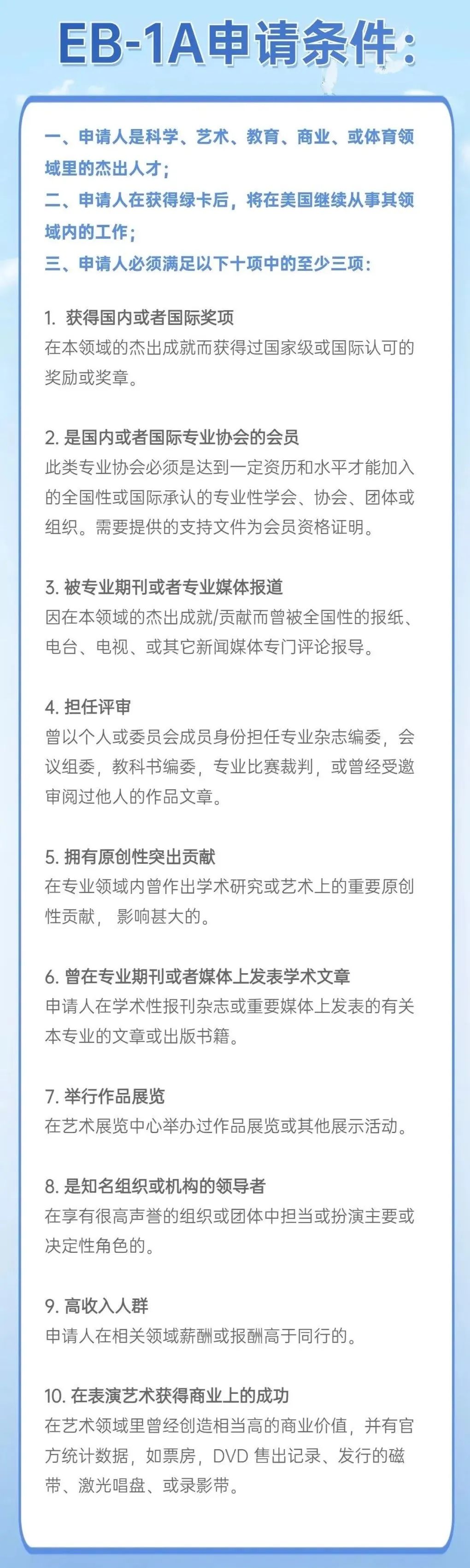 有不少人士看到以上條件,會被這樣的“高要求”給嚇到,其實(shí)美國移民局針對EB1A給出了10項(xiàng)條件,只要滿足其中3項(xiàng)就可申請!