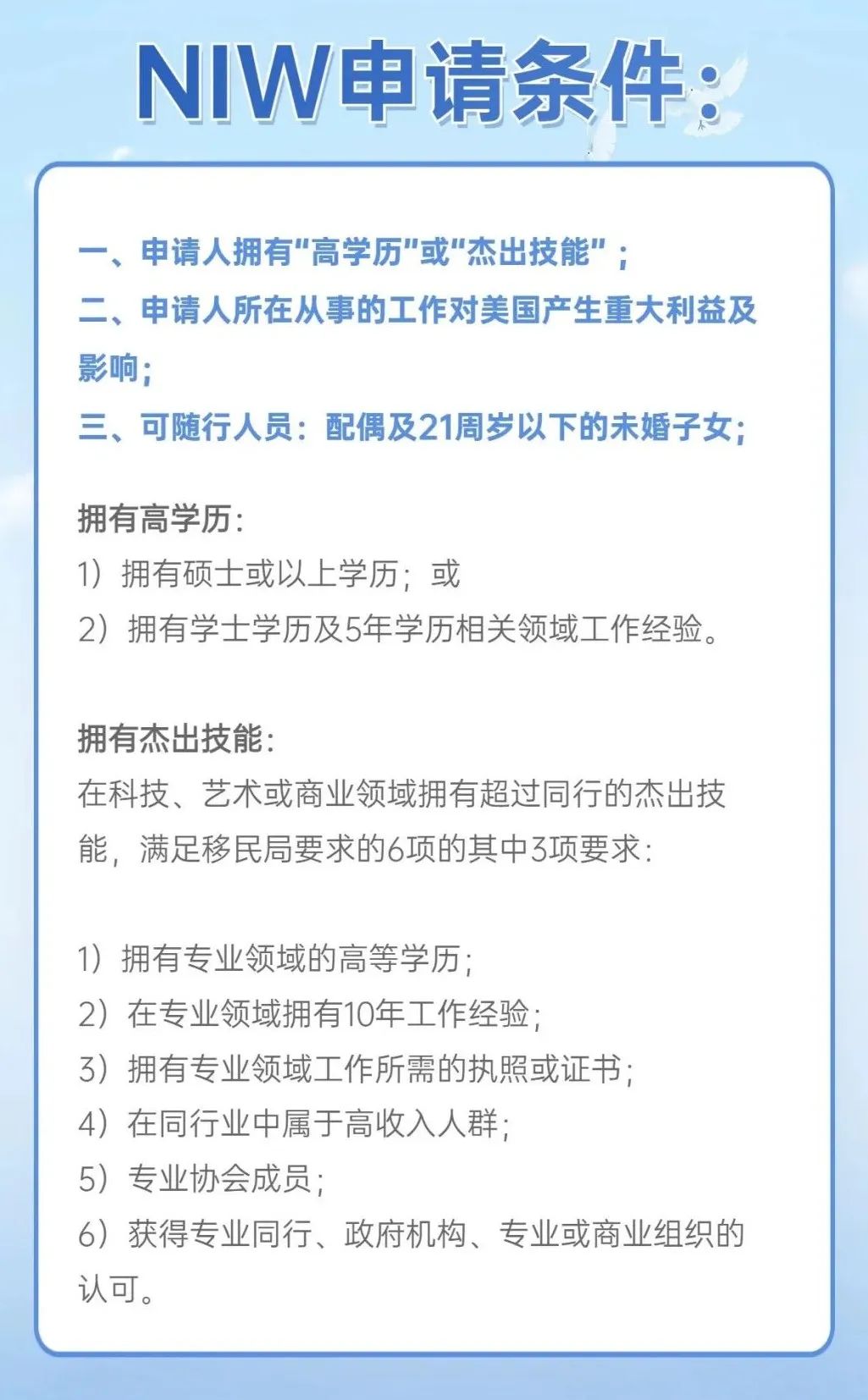NIW國家利益豁免是美國職業(yè)綠卡申請第二優(yōu)先類別。是指行業(yè)內(nèi)優(yōu)秀外國人士能為美國國家利益做出或有能力做出重要貢獻(xiàn),國家豁免其勞工證,通過審批可順利獲得永居綠卡。