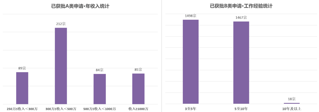 分別從年收入維度對(duì)A類申請(qǐng)、從工作經(jīng)驗(yàn)維度對(duì)B類申請(qǐng)的主申請(qǐng)人情況進(jìn)行數(shù)據(jù)統(tǒng)計(jì),得出如下分布: