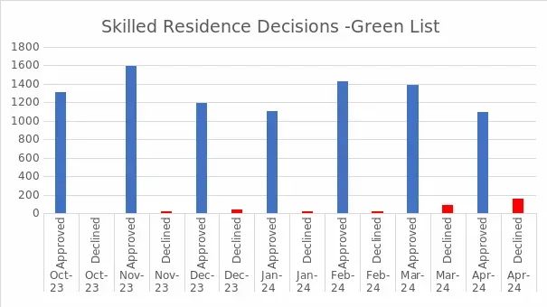 同期的綠名單,截止到2024年4月30日,移民局審理完結(jié)9489份綠名單技術(shù)移民申請,包括綠名單一類與二類申請,其中9111份批準(zhǔn),拒簽378份,批準(zhǔn)率高達96%。