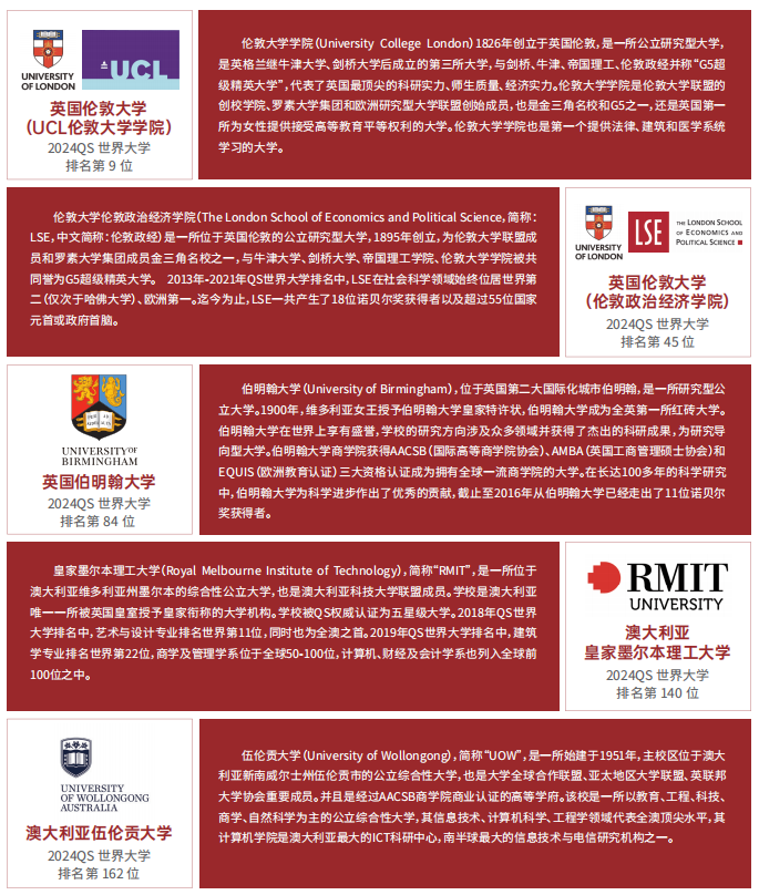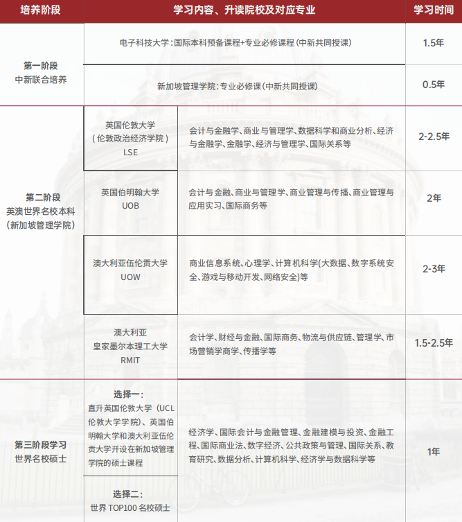 近年來(lái),新加坡高等教育蓬勃發(fā)展,已成為全球教育中心之一,是中國(guó)學(xué)生出國(guó)留學(xué)的熱門(mén)選擇。為滿足更多學(xué)生申請(qǐng)海外名校的需求,電子科技大學(xué)與新加坡管理學(xué)院簽署人才聯(lián)合培養(yǎng)協(xié)議,聯(lián)合成立海外教學(xué)中心(成都),開(kāi)辦新加坡國(guó)際名校本碩貫通聯(lián)合培養(yǎng)項(xiàng)目,雙方根據(jù)倫敦大學(xué)(LSE倫敦政治經(jīng)濟(jì)學(xué)院)、伯明翰大學(xué)、皇家墨爾本理工大學(xué)和伍倫貢大學(xué)等國(guó)際名校的學(xué)術(shù)要求共同開(kāi)展課程教學(xué)和學(xué)業(yè)管理,進(jìn)而幫助項(xiàng)目學(xué)員順利進(jìn)入海外名校學(xué)習(xí)深造并完成學(xué)業(yè)。
