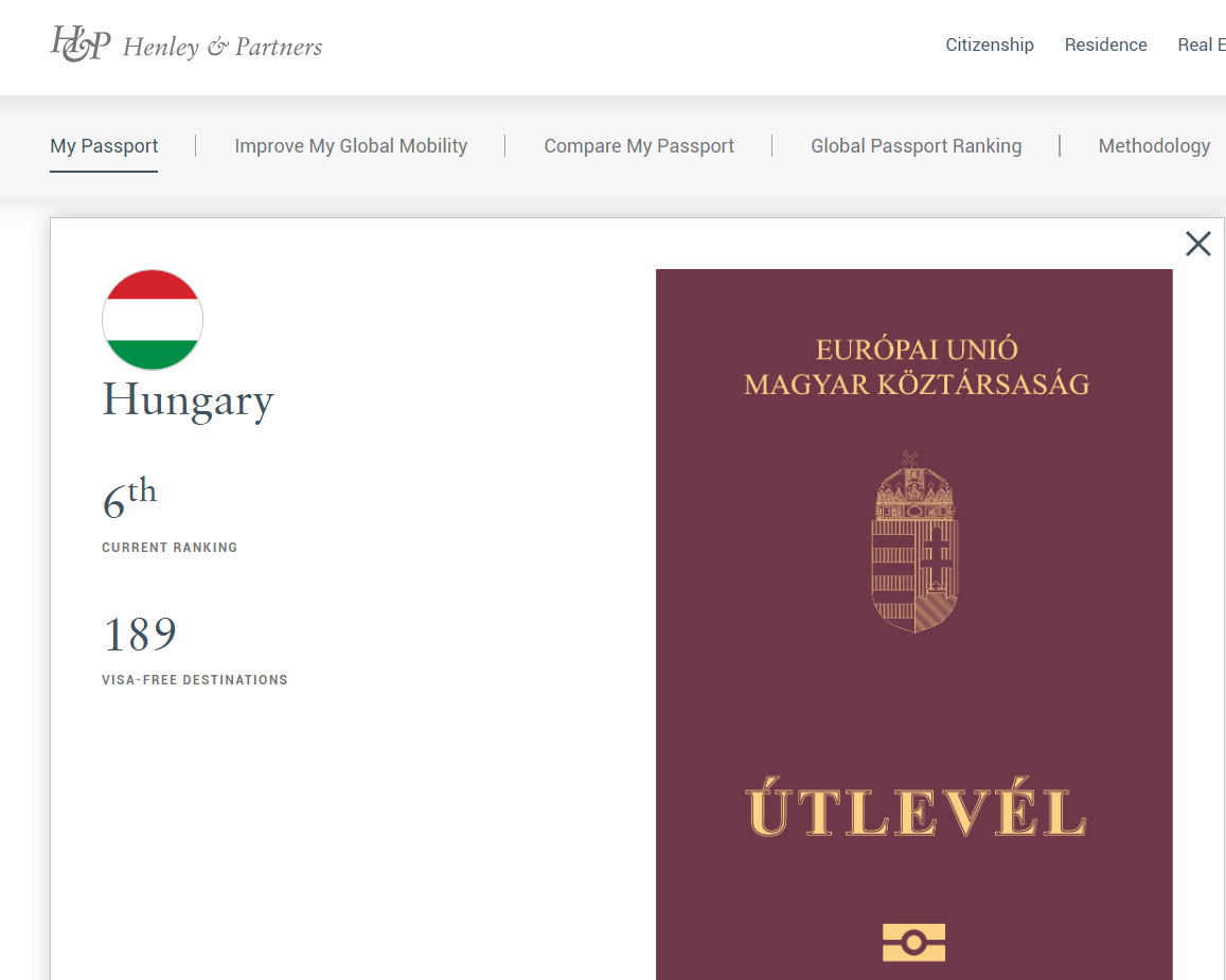 亨利護照指數(shù)每月更新一次,目前匈牙利護照排名第6,可免簽189個國家/地區(qū)。