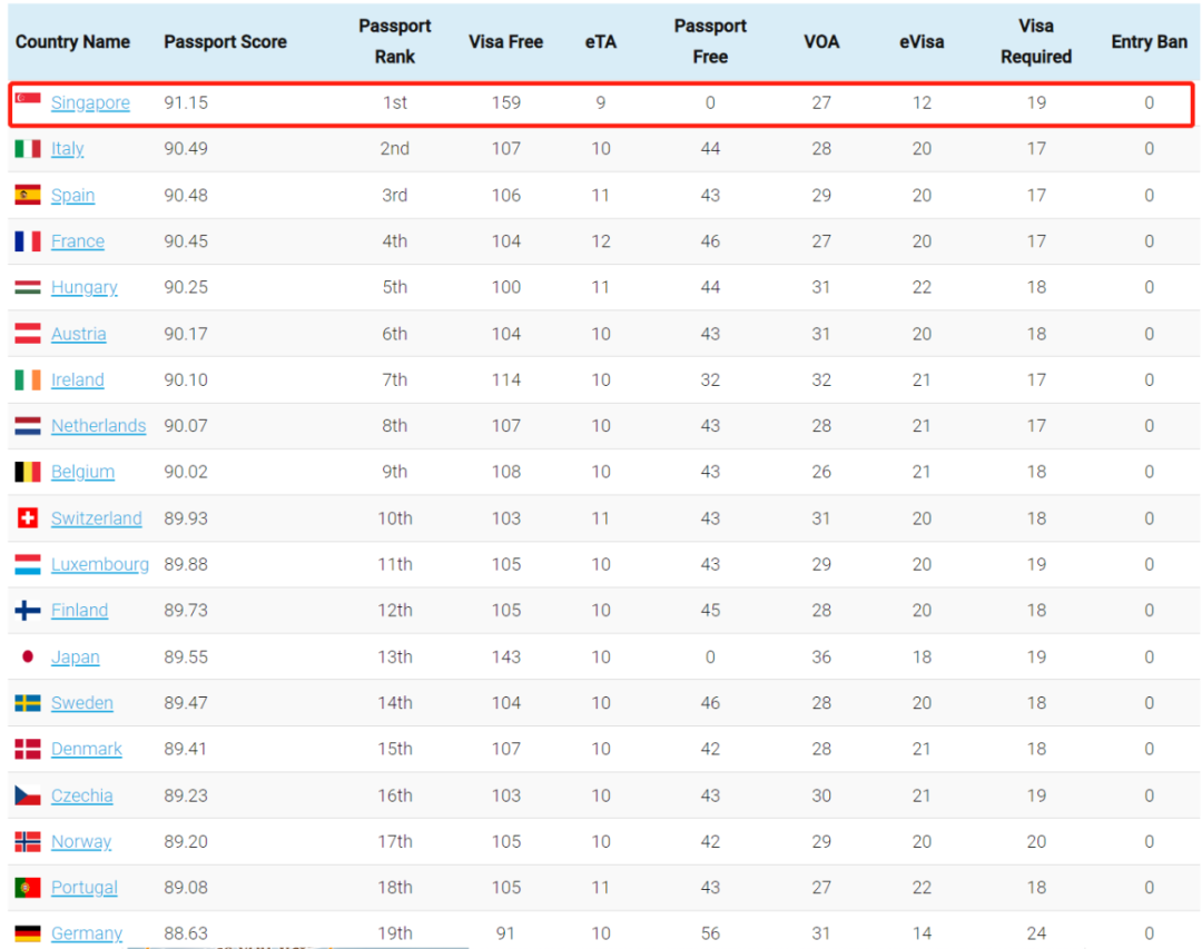 今年的全球護照排名前10名依次為:新加坡、意大利、西班牙、法國、匈牙利、奧地利、愛爾蘭、荷蘭、比利時和瑞士。