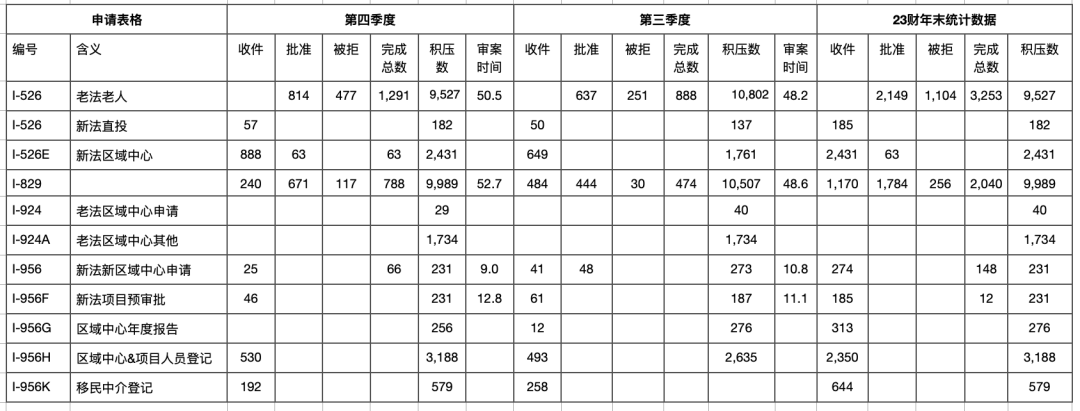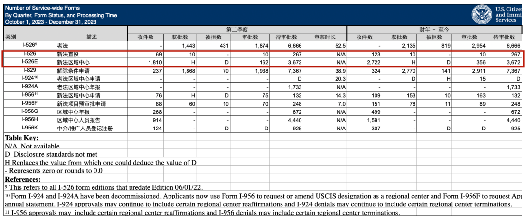 ? 2023年10-12月,共32份直投I-526,581份區(qū)域中心I-526E,合計(jì)613份,平均每月204份申請(qǐng);