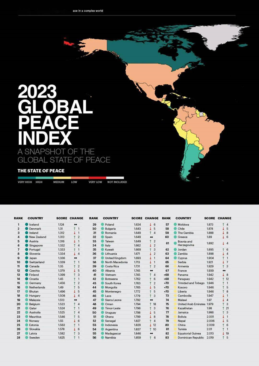 據(jù)近期發(fā)布的“2023年全球和平指數(shù)”顯示,在全球163個(gè)國家及地區(qū)中,和平指數(shù)排名前10的國家,有7個(gè)位于歐洲,其中,冰島奪得冠軍、丹麥第二名、愛爾蘭第三名、葡萄牙第七名、瑞士第十名。還有兩個(gè)亞洲國家上榜前十,分別是第六名新加坡、第九名日本。大洋洲國家有一個(gè),第四名新西蘭。