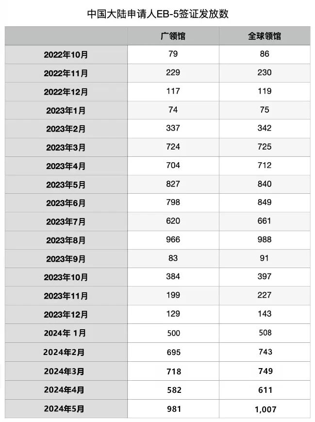 以下是EB-5區(qū)域中心計(jì)劃重啟之后,2022年10月至2024年5月,給中國大陸出生的申請人發(fā)放的EB-5簽證統(tǒng)計(jì)數(shù)據(jù):