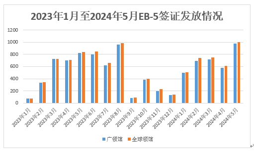 ★ 廣領(lǐng)館:在2024年5月,廣領(lǐng)館一共簽發(fā)了1,345張職業(yè)移民簽證,其中EB-5類別獲得了981張。