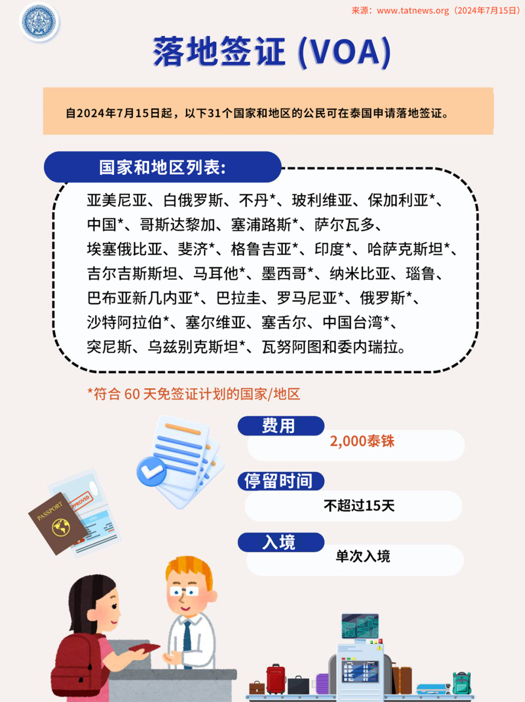 泰國將允許31個國家和地區(qū)的公民(此前為19個國家)在入境時在移民檢查站申請VOA。根據(jù)該計(jì)劃,游客可以停留不超過15天,以旅游為目的。簽證費(fèi)為2,000泰銖。