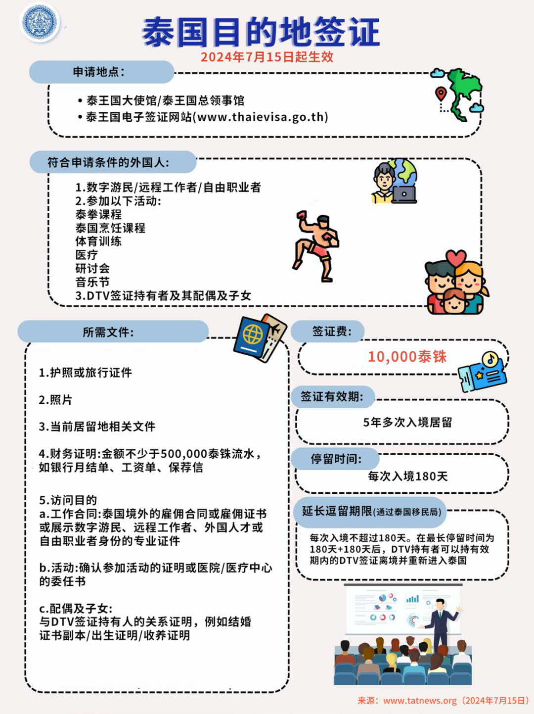 泰國將推出一項(xiàng)新的簽證措施,即泰國目的地簽證 (DTV),面向遠(yuǎn)程工作者、數(shù)字游民、自由職業(yè)者以及泰拳課程、泰國烹飪課程、體育訓(xùn)練、醫(yī)療、研討會和音樂節(jié)等活動的參與者。DTV簽證持有者的配偶及子女也有資格申請。