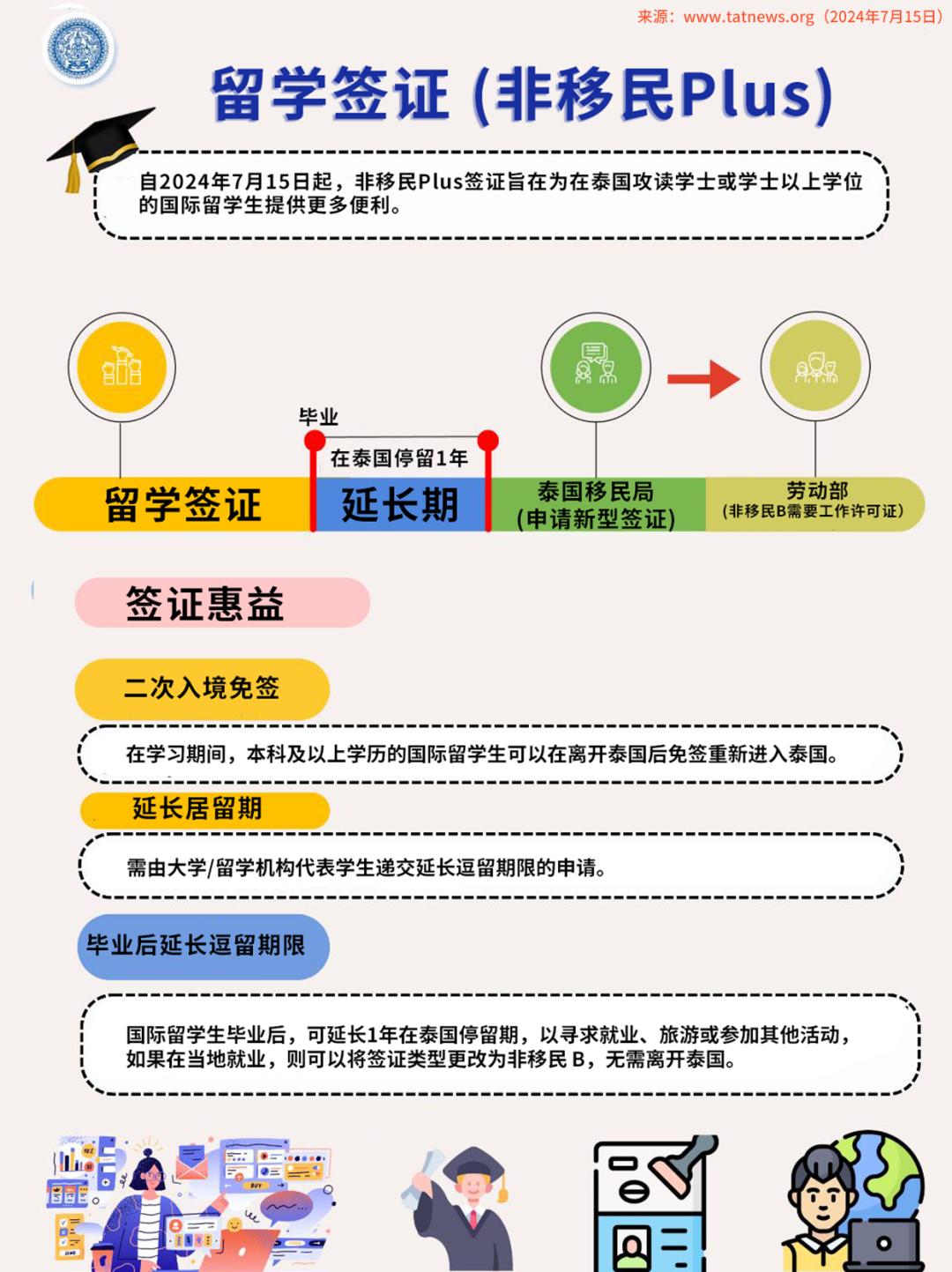 泰國將延長在泰國攻讀學(xué)士或?qū)W士以上學(xué)位的國際留學(xué)生的居留期限,使其畢業(yè)后可以再停留一年。他們還可以在延長的期限內(nèi)尋找工作,如果在當(dāng)?shù)鼐蜆I(yè),則可以將簽證類型更改為非移民 B,無需離開泰國。