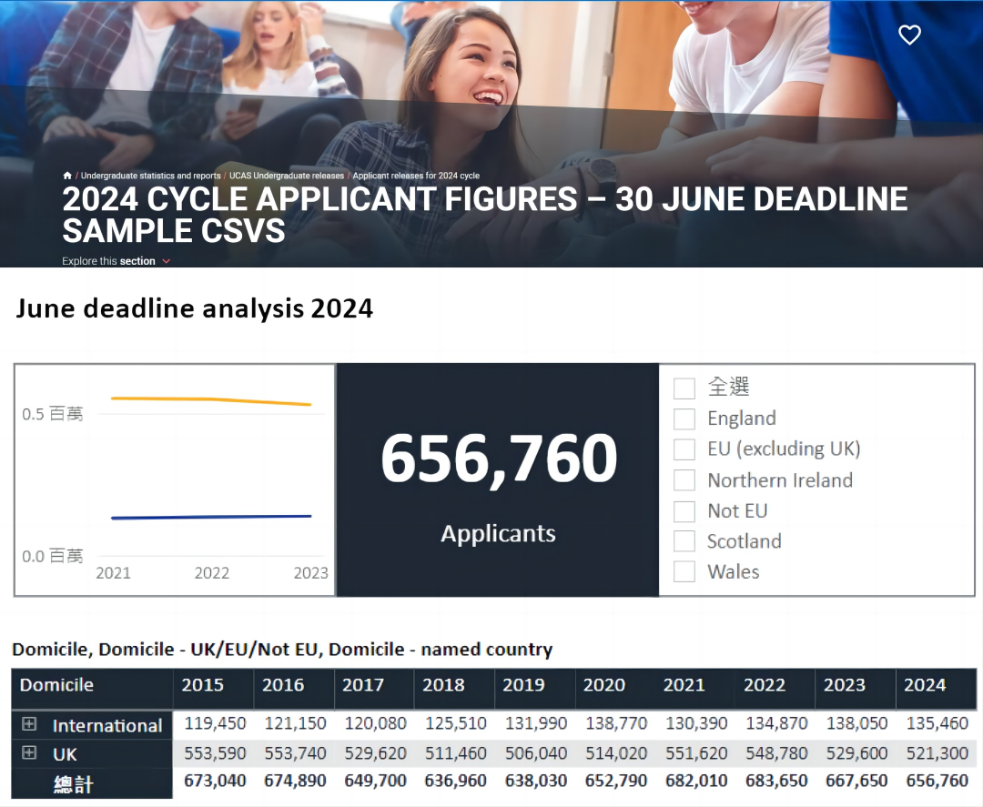 根據(jù)UCAS統(tǒng)計,2024入學申請,全球申請英國本科的人數(shù)656,760人,與上個申請季的同期數(shù)據(jù)(667,650人)相比,總體申請人數(shù)減少了10,890人,下降大約1.63%。