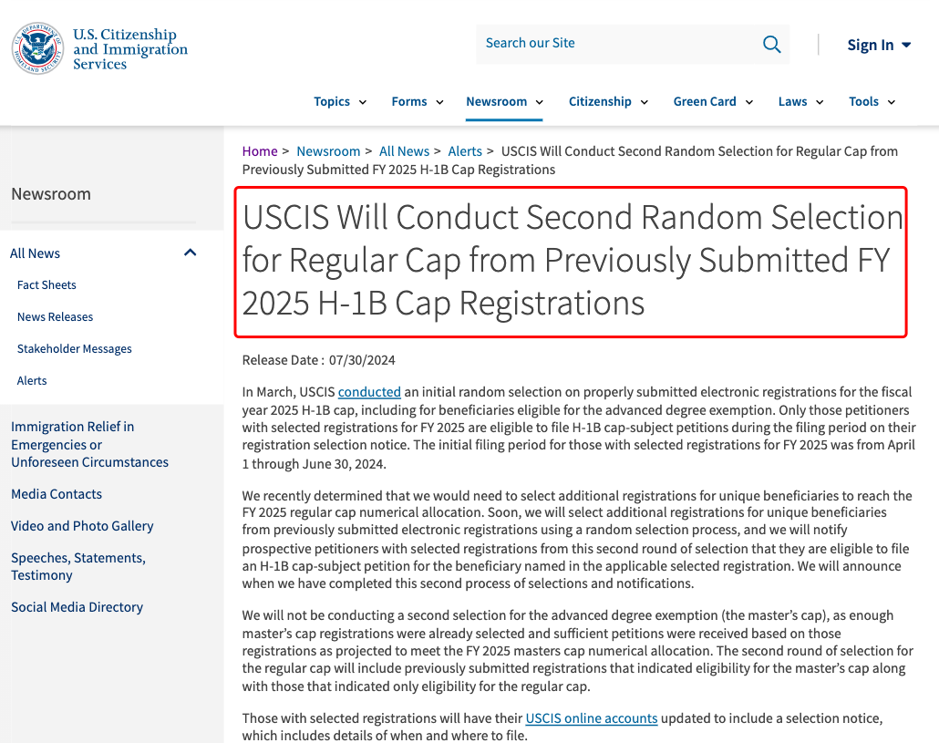 當?shù)貢r間7月30日上午,美國移民局USCIS官網(wǎng)宣布:將對2025財年H-1B未中簽的申請人進行第二輪抽簽。