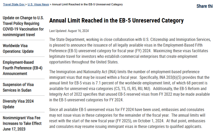 近日,美國(guó)國(guó)務(wù)院在官網(wǎng)發(fā)布消息稱,2024財(cái)年的所有EB-5非預(yù)留類別的配額均已發(fā)放完畢。
