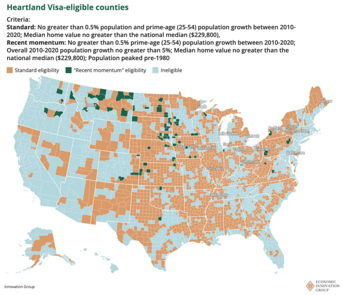 該決議建議推出一項(xiàng)“心臟地帶移民簽證”(Heartland Immigrant Visa,本文稱“鐵銹簽證”),給美國“心臟地帶”生活的技術(shù)人才,每年發(fā)放10萬個(gè)簽證名額,并讓他們快速獲得美國綠卡。