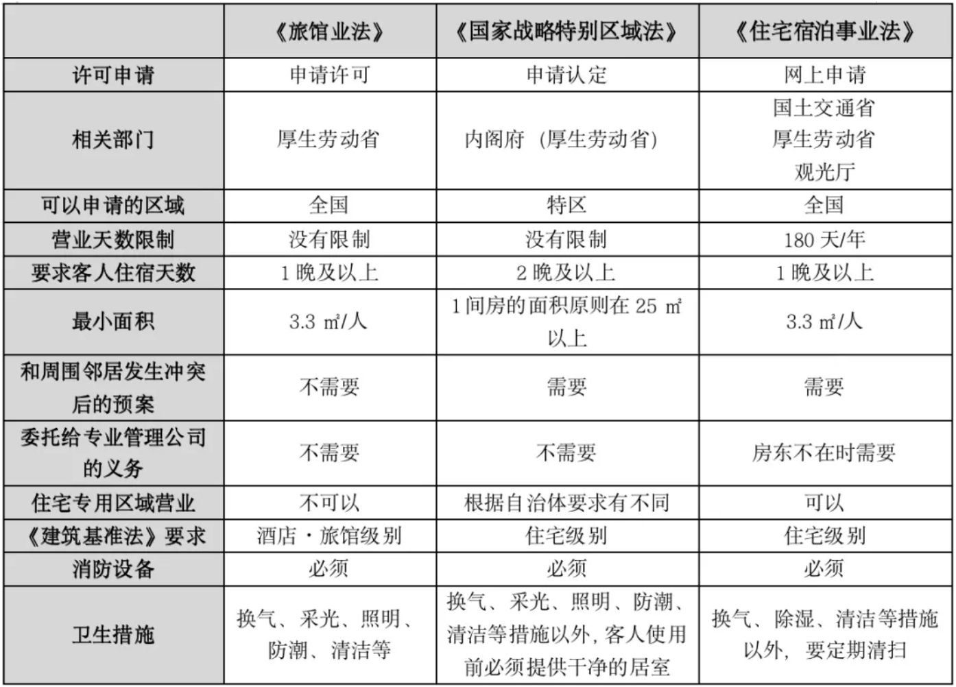 目前,日本民宿有三種法律的約束:《旅館業(yè)法》、《國(guó)家戰(zhàn)略特別區(qū)域法》、《住宅宿泊事業(yè)法》。根據(jù)三種法律取得的“營(yíng)業(yè)執(zhí)照”以及營(yíng)業(yè)內(nèi)容都是不同的。