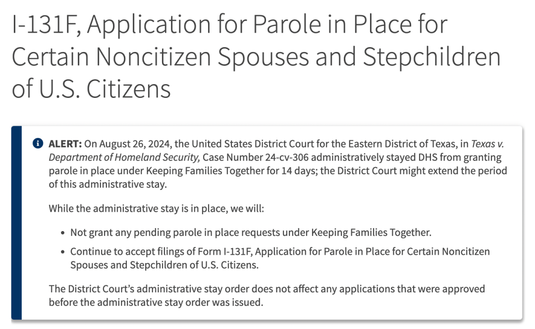 對(duì)于在8月26日法庭發(fā)布行政暫停令之前,已成功獲得I-131F批準(zhǔn)的申請(qǐng)人,此行政暫停令對(duì)其并無影響。申請(qǐng)人可以用已獲批準(zhǔn)的I-131F,繼續(xù)推進(jìn)I-130和I-485綠卡申請(qǐng)的流程。