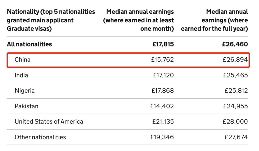 中國籍畢業(yè)生年薪收入(至少工作一個(gè)月/全年工作)的中位數(shù)分別是17,81英鎊和26,894英鎊。