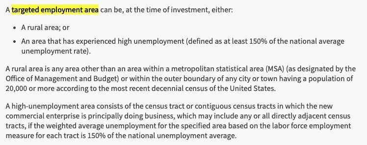 原本,EB-5項(xiàng)目的初衷在于通過吸引外資來支持經(jīng)濟(jì)相對滯后或面臨壓力的鄉(xiāng)村及不發(fā)達(dá)地區(qū)的復(fù)興與發(fā)展。然而,歷史上曾出現(xiàn)資金流向偏離初衷,過度集中于大城市的現(xiàn)象。鑒于此,EB-5新政應(yīng)運(yùn)而生,其核心舉措之一便是為TEA(目標(biāo)就業(yè)區(qū),即經(jīng)濟(jì)特區(qū))項(xiàng)目特別預(yù)留簽證配額,并對TEA的界定標(biāo)準(zhǔn)進(jìn)行了更為嚴(yán)格和細(xì)致的規(guī)范,旨在確保投資資金能夠更有效地促進(jìn)那些真正需要經(jīng)濟(jì)提振的地區(qū)的發(fā)展。