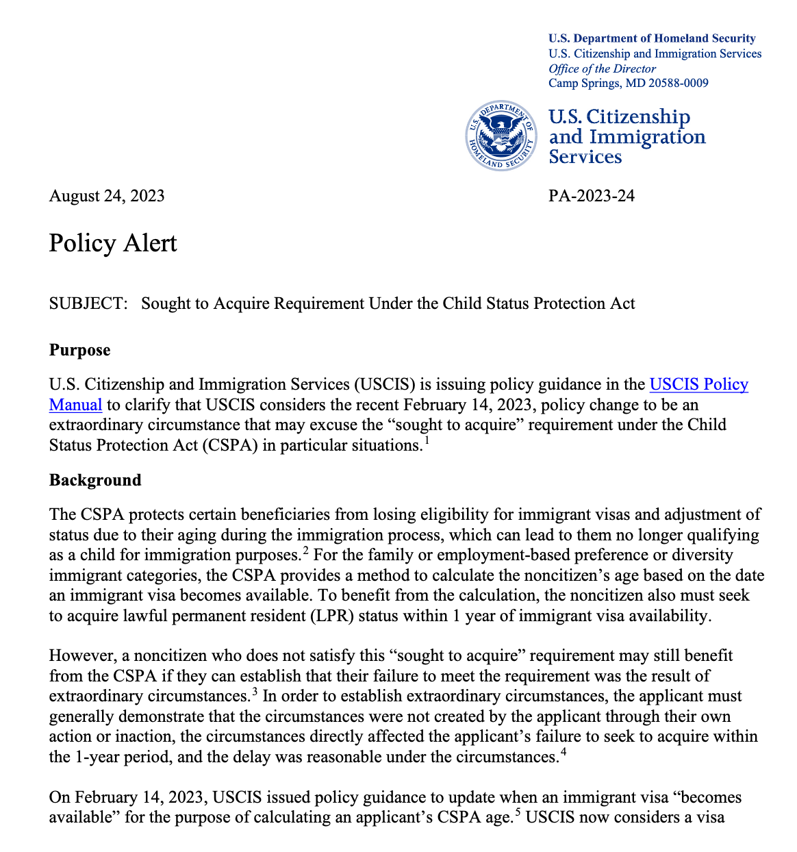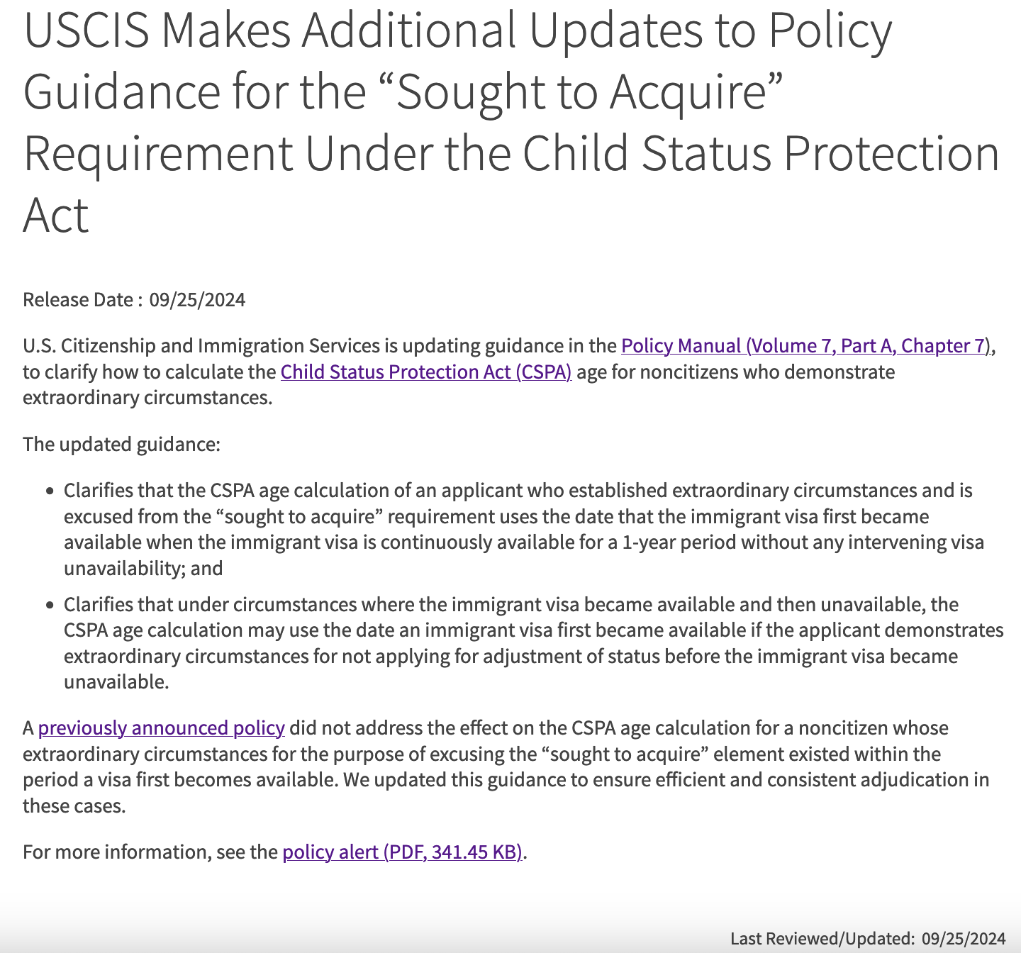 9月25日,美國移民局公示:再度放寬子女年齡鎖定的條件,因排期倒退而未能在排期到的一年內(nèi)及時(shí)遞交I-485申請,完成“seek to acquire”動作的子女,也可以申請豁免。