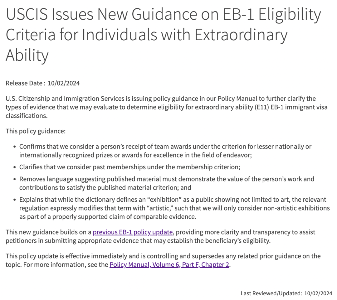 當(dāng)?shù)貢r間10月2日,美國移民局(USCIS)發(fā)布新指南,明確了數(shù)條針對EB-1A類別的審核標(biāo)準(zhǔn),即日起生效。