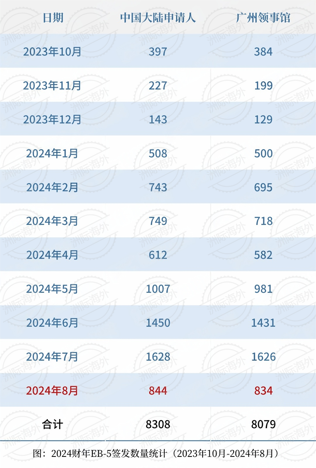8月,中國大陸申請人共計獲發(fā)1027張移民類簽證,其中EB-5簽證844張。