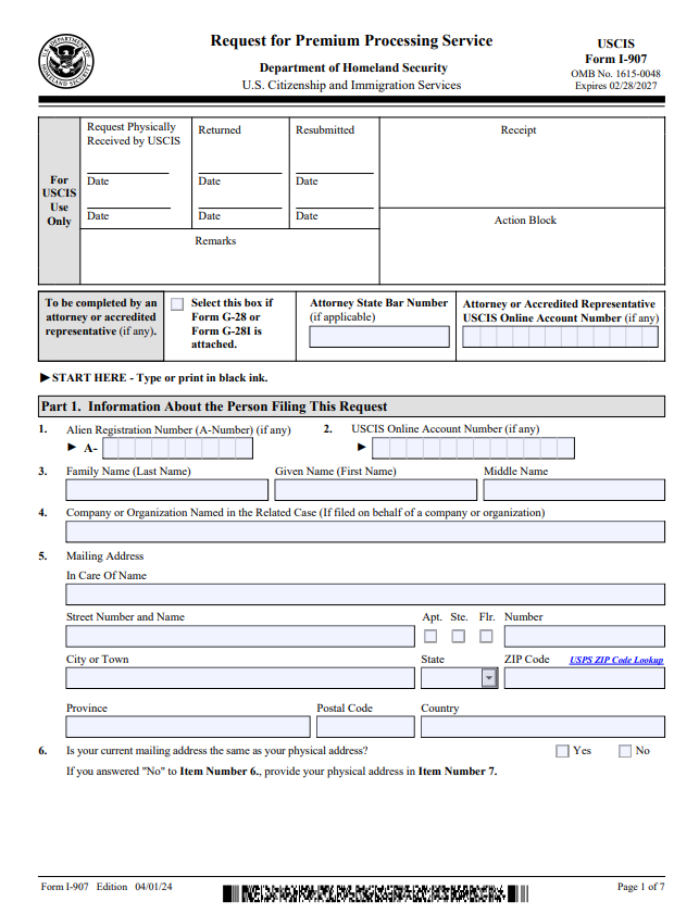 I-907是《加急處理申請(qǐng)》表格。通過(guò)支付額外費(fèi)用,可以加快I-140等申請(qǐng)的處理速度,EB1A通常能在15天內(nèi)得到回復(fù),NIW加急周期通常是45天。