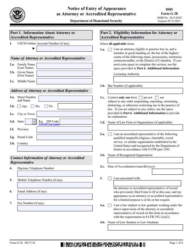 G-28是《律師或授權(quán)代表通知書》表格。如果你聘請(qǐng)了律師或移民代理來(lái)處理你的移民申請(qǐng),律師或代理需要填寫這份表格,代表你與美國(guó)移民局(USCIS)溝通。