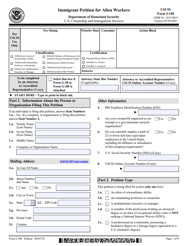 I-140是《移民申請(qǐng)外籍勞工資格》表格。這是EB-1A申請(qǐng)的核心文件,以證明申請(qǐng)人符合綠卡申請(qǐng)的要求。