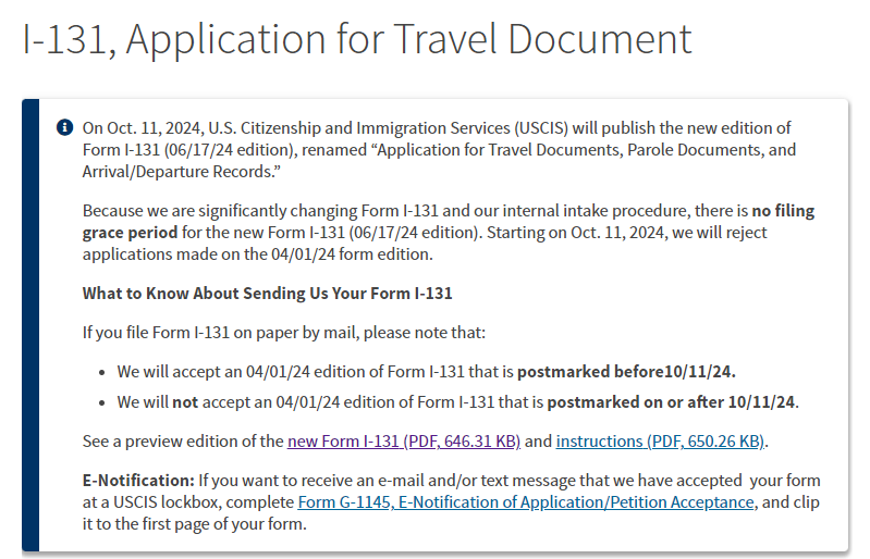 可以到美國移民局網(wǎng)站直接下載:https://www.uscis.gov/sites/default/files/document/forms/Preview_06-17-2024_Edition_USCIS_WILL_REJECT_IF_FILED_BEFORE_10-11-2024_Form_I-131.pdf