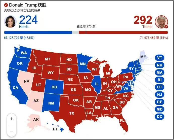 據美聯(lián)社報道,時隔四年,川普以292票對224票,強勢奪回白宮領導權!