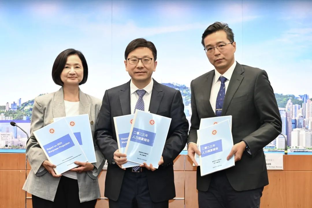 ▲勞工及福利局局長孫玉菡(中)于11月14日就“2023年人力推算報(bào)告”舉行記者會,概述“2023年人力推算”報(bào)告主要結(jié)果。