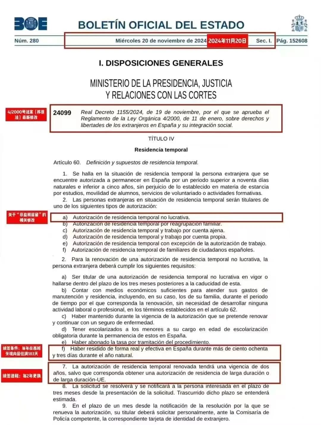 2024年3月4日,西班牙發(fā)布了有關(guān)取消《外國(guó)人法規(guī)》中臨時(shí)居留離境時(shí)間的規(guī)定:取消臨時(shí)居留持有者每年必須在西班牙居住183天的規(guī)定。