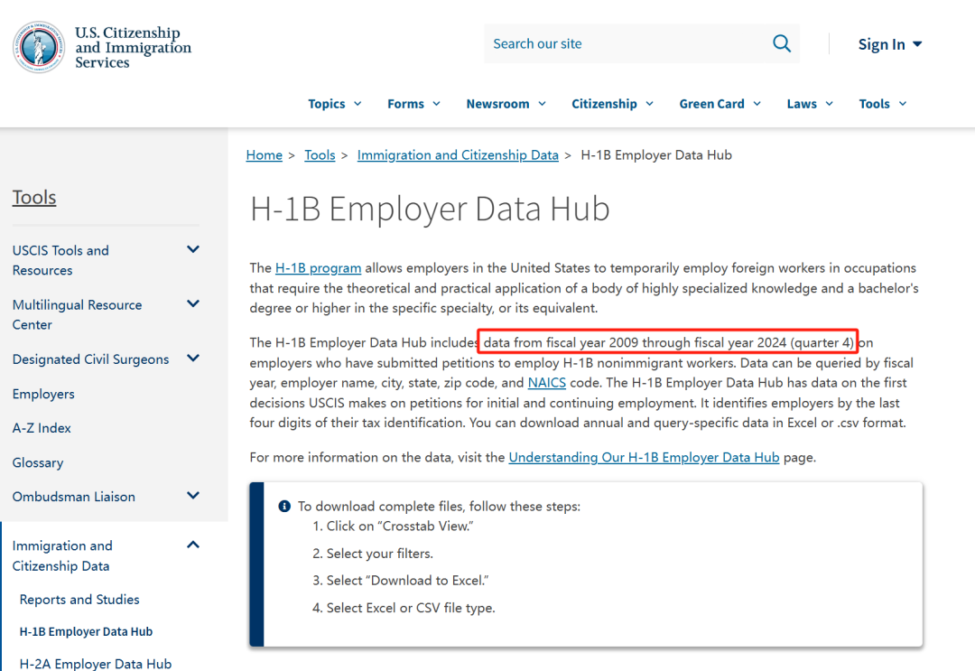 該名單涵蓋了從2009財(cái)年到2024財(cái)年(第4季度)期間,各大公司提交的H-1B申請數(shù)據(jù)。經(jīng)過移民局的整理后,所得出的一份權(quán)威且具有參考價值的H-1B雇主名單。