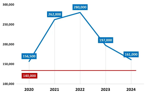 - 2020至2024財(cái)年美國(guó)職業(yè)移民綠卡配額走勢(shì)圖 -